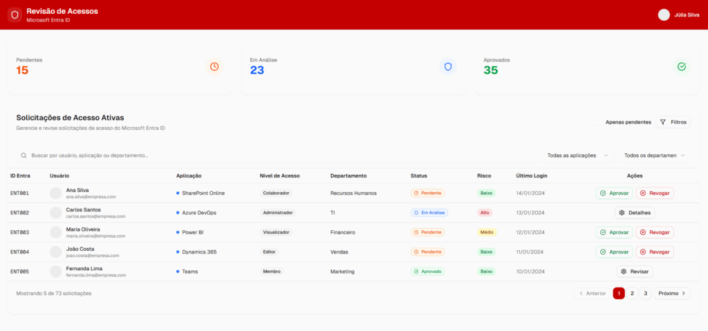 O principal objetivo era simplificar. A organização precisava de uma forma mais estruturada, fluida e segura de realizar a revisão periódica de acessos, sem depender de dezenas de planilhas e e-mails.